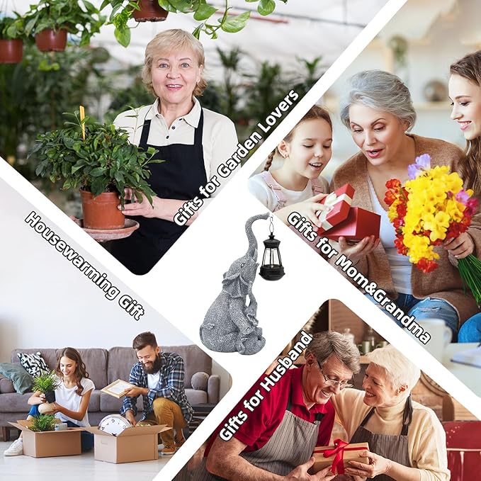 - IDEAL GARDEN GIFT: The solar powered elephant statue is cute and easy to operate. This elephant statue is an ideal birthday gift and garden gift for women, mothers, grandmothers, girlfriends, wives, and can also be used as a new house warming gift, Christmas gift, Thanksgiving gift and so on for your family, friends, neighbors.
