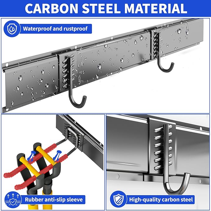 - ADJUSTABLE & VERSATILE STORAGE: tool organizers and storage features 3 tracks and 9 adjustable hooks, a versatile garage organizer for your garage. Customize height and hook placement for various items, from garden tools to folding chairs