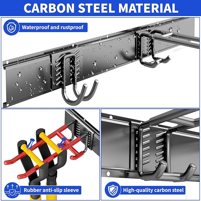 - HEAVY-DUTY 300 LBS CAPACITY: garage organizers and storage Constructed from premium steel with a rust-resistant, double powder-coated finish. Rubber-coated hooks prevent slipping. Built for long-lasting durability in your garage or garden